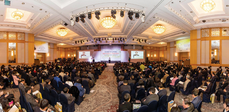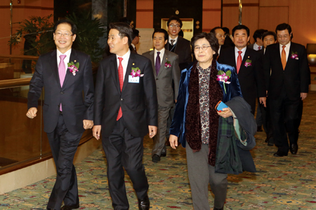 ▲ 정구정 회장과 오제세 보건복지위원장과, 유승희 의원이 환담을 나누며 행사장으로 입장하고 있다. 이용섭, 김진표, 나성린 의원, 제정부 법제처장, 추경호 차관이 그 뒤를 있고 있다.
