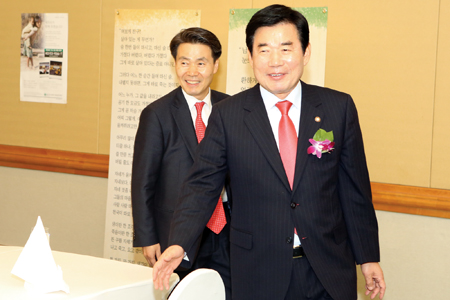 ▲ 정구정 회장과 김진표 의원이 밝게 웃으며 환담장안으로 들어오고 있다.