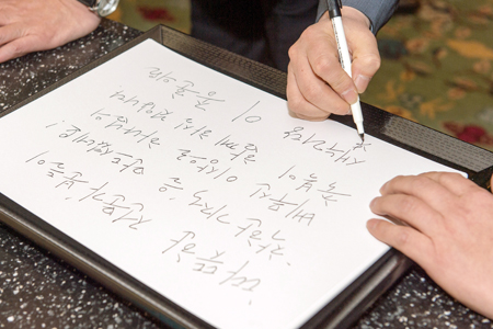 ▲ 이종훈 의원이 방명록을 쓰고 있다. 이 의원은 “따듯한 전문가분들이 착한 기적을 만드셨네요. 베푸신 이상으로 하나님의 축복이 함께 하실 것입니다”라는 문구를 남겨 참석자들에게 감동을 주었다.