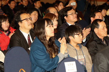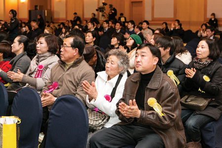 ▲ 지원금 수혜자들이 박수를 치며 행사를 지켜보고 있다.