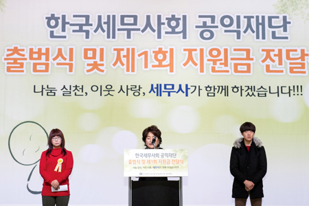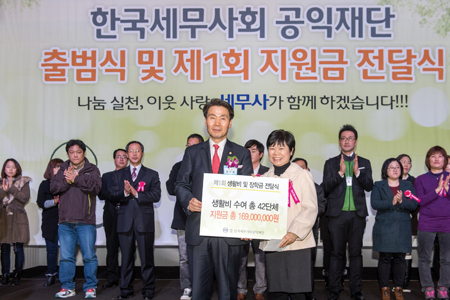 ▲ 전달식에는 거동이 불편해 움직일 수 없는 일부 수혜자를 제외하고는 대상자 대부분이 직접 참석해 한국세무사회 공익재단 출범식을 함께 축하하고 생활비 및 장학금을 받았다.