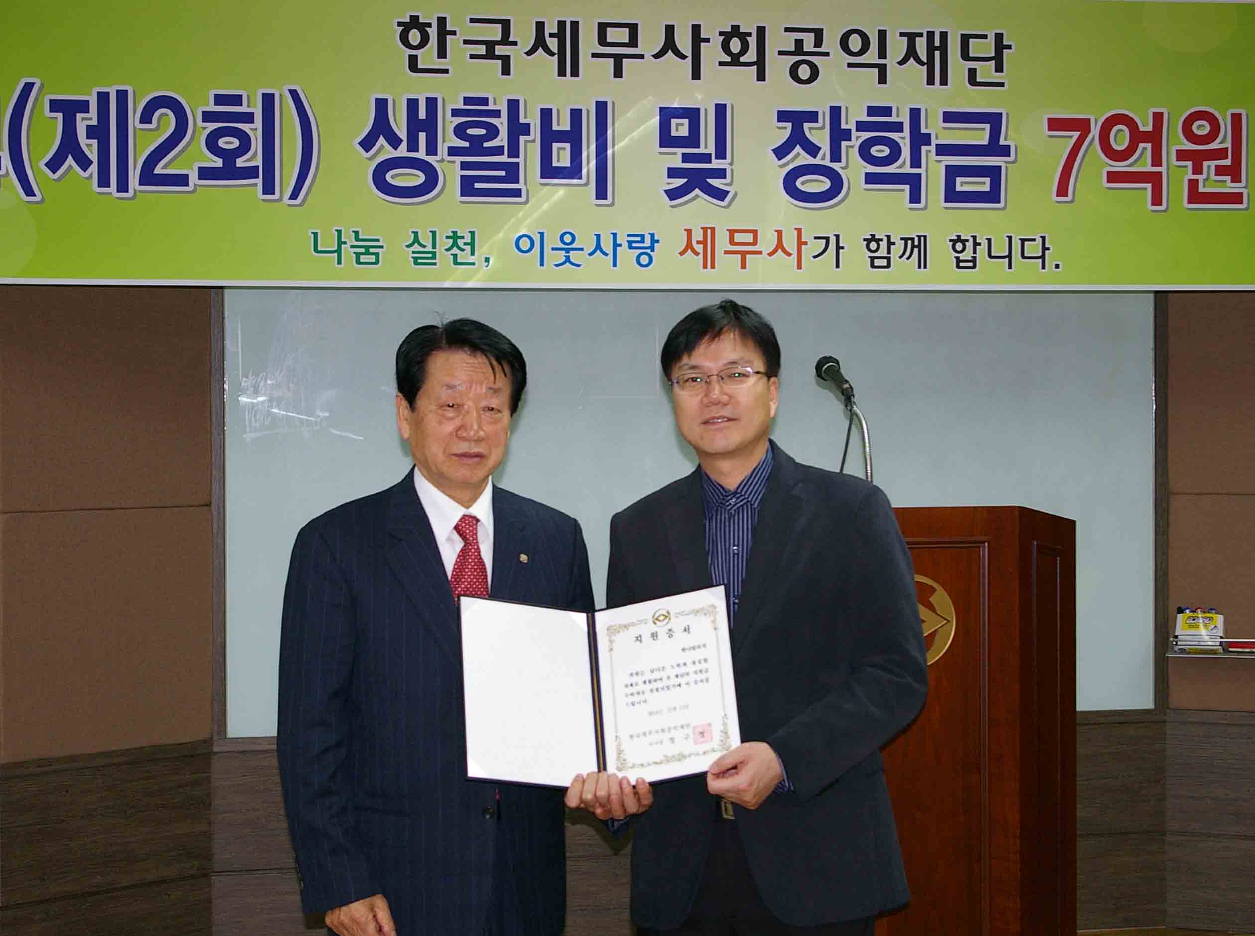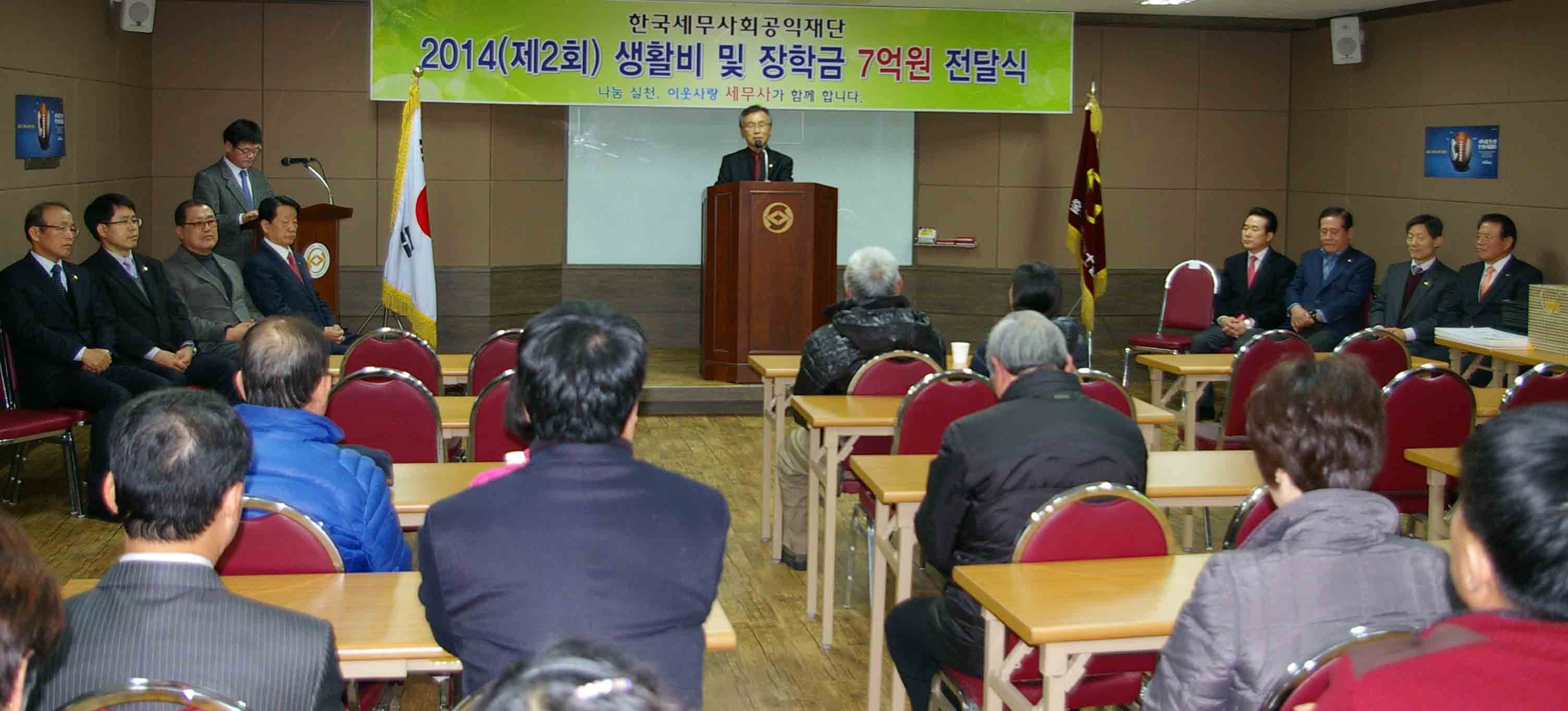 나성린 의원은 “세무사회가 앞장서서 공익재단을 만들어 사회공헌활동에 감사드리고 앞으로도 많은 지원”을 부탁하고, 수여받는 분에게는 “큰 금액은 아니지만 겨울 따뜻하게 보내시고 학생들은 공부를 더 열심히 하길 바란다”고 축하했다.