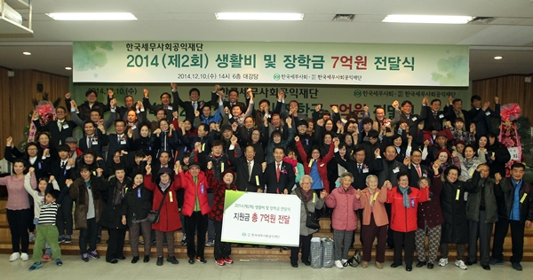 ▲ 사진은 지난해 12월10일 거행된 한국세무사회공익재단의 '생활비 및 장학금 7억원 전달식'의 모습이다.[사진제공: 한국세무사회]