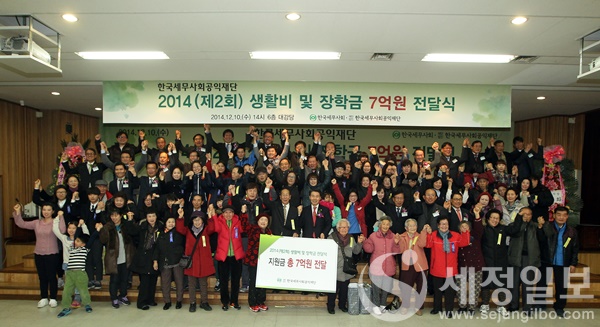 ▲ 사진은 2014년 12월 10일 열린 한국세무사회공익재단의 '(제2회) 생활비 및 장학금 7억원 전달식' 모습이다.[사진: 한국세무사회]