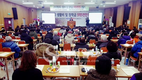 ▲ 2017(제5회) 생활비 및 장학금 5억5천만원 전달식이 끝난후 참석자들이 다함께 모여 기념촬영을 하고 있다.