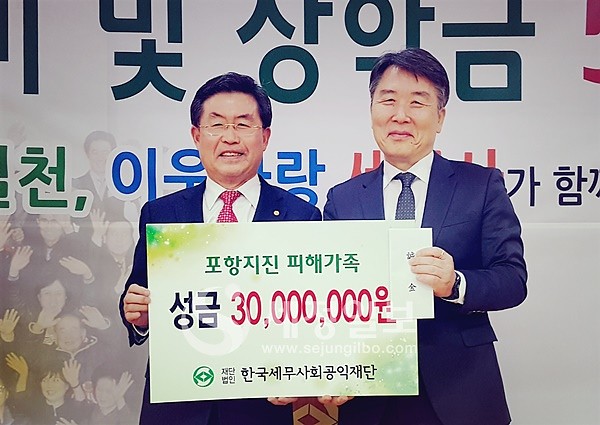 특히 세무사회는 이날 전달식에서 지난달 발생한 포항지역 지진 피해 복구 지원을 위해 ‘전국재해구호협회’ 박영진 사무총장에게 3000만원의 성금을 전달했다.