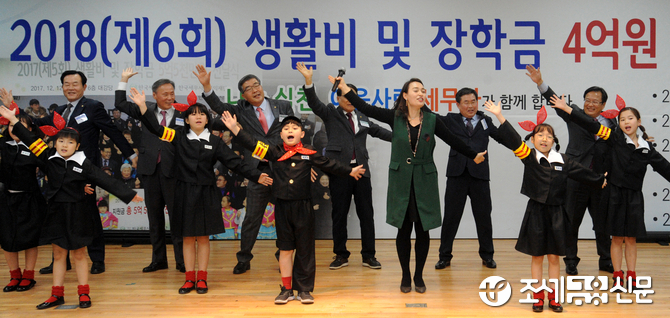 ▲ 한국세무사회 임원진들이 11일 오후 서울 한국세무사회 회관에서 열린 한국세무사회공익재단 2018년도 생활비 및 장학금 전달식에서 아이들과 함께 율동을 맞추며 흥겨운 시간을 보내고 있다.