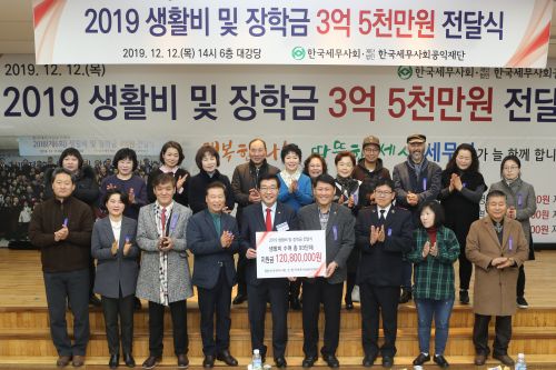 한국세무사회 공익재단은 12일 오후 한국세무사회관 6층 대강당에서 '생활비 및 장학금 전달식'을 열고 저소득층에게 생활비·장학금 3억5000만원을 전달했다.