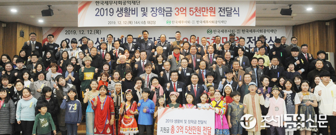 (조세금융신문=김용진 기자) 원경희 한국세무사회 회장 등 한국세무사회 공익재단 관계자들이 12일 오후 한국세무사회관에서 열린 2019년 생활비 및 장학금 전달식에서 참석자들과 기념 촬영을 하고 있다.