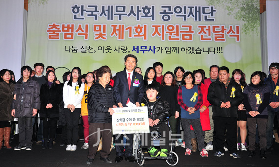 한국세무사회(회장 정구정)는 12일 오후 2시 서울 반포 JW메리어트 호텔에서 한국세무사회공익재단 출범식을 갖고 소외계층과 저소득층 350명에게 3억5000만원의 생활비 및 장학금을 전달했다.